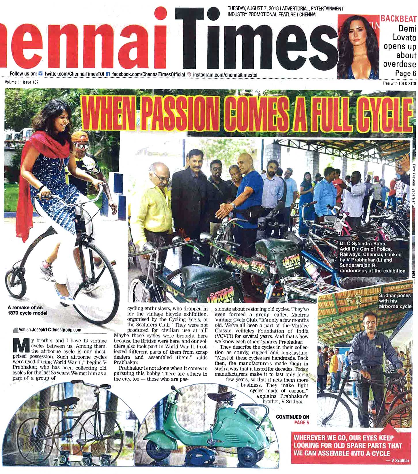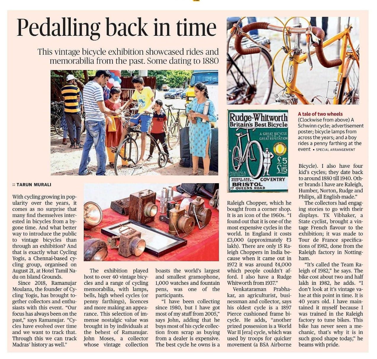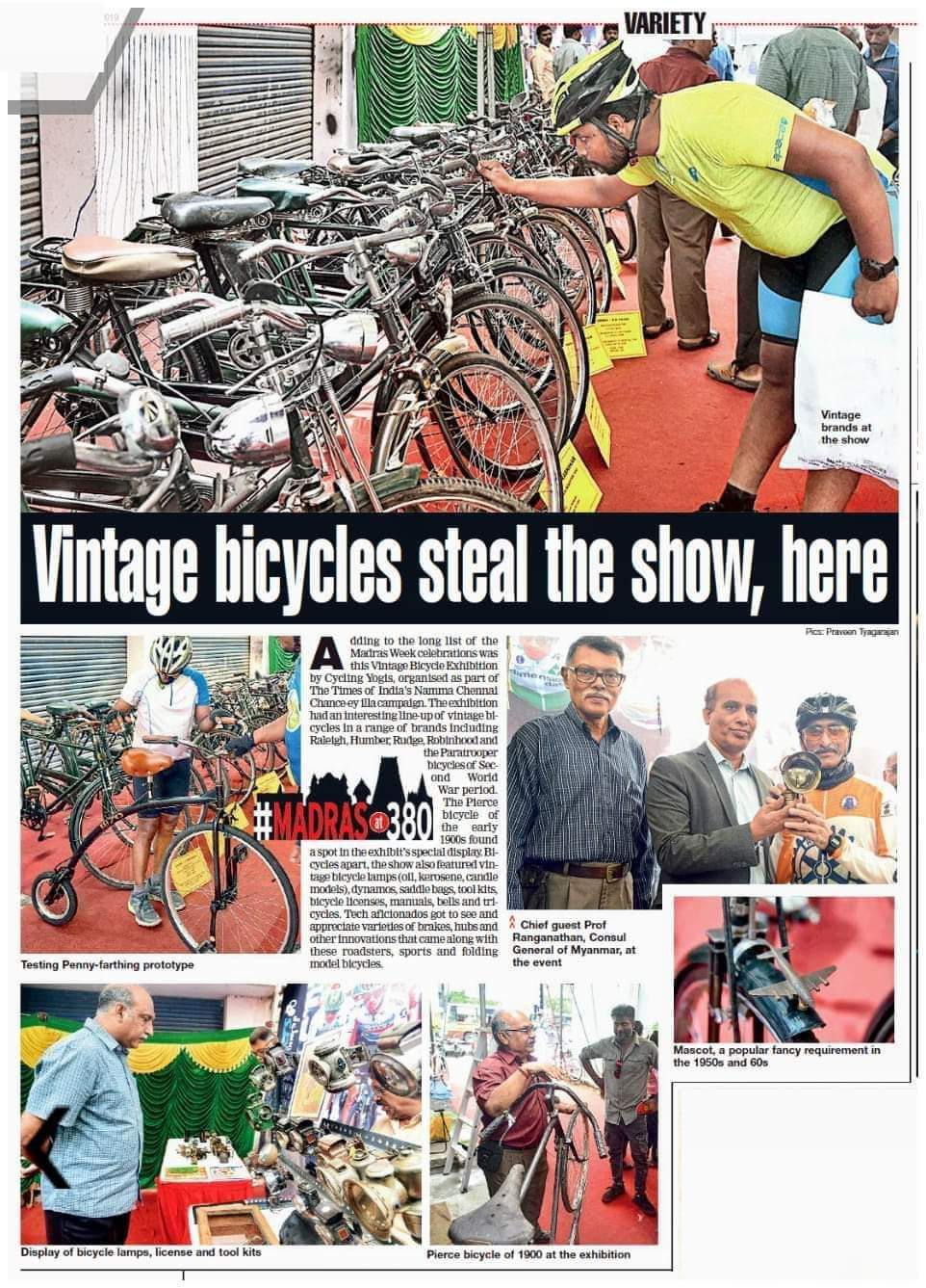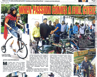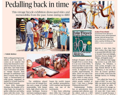 Since the year 2018 Vintage Bicycles Exhibition have been held on the occasion of Madras Week Celebration. Vintage brands on display include Raleigh, Humber, Rudge, Phillips, BSA , Hercules, Robinhood, Paratrooper Bicycles of Second World War period, Pierce Bicycle of early 1900's and Road Bikes. Also in the exhibits are varieties of Vintage Bicycle Lamps (Oil, Kerosene, Candle Models), Dynamos, Saddle Bags, Tool Kits, Bicycle Licenses, Manuals, Bells and Tricycles.
